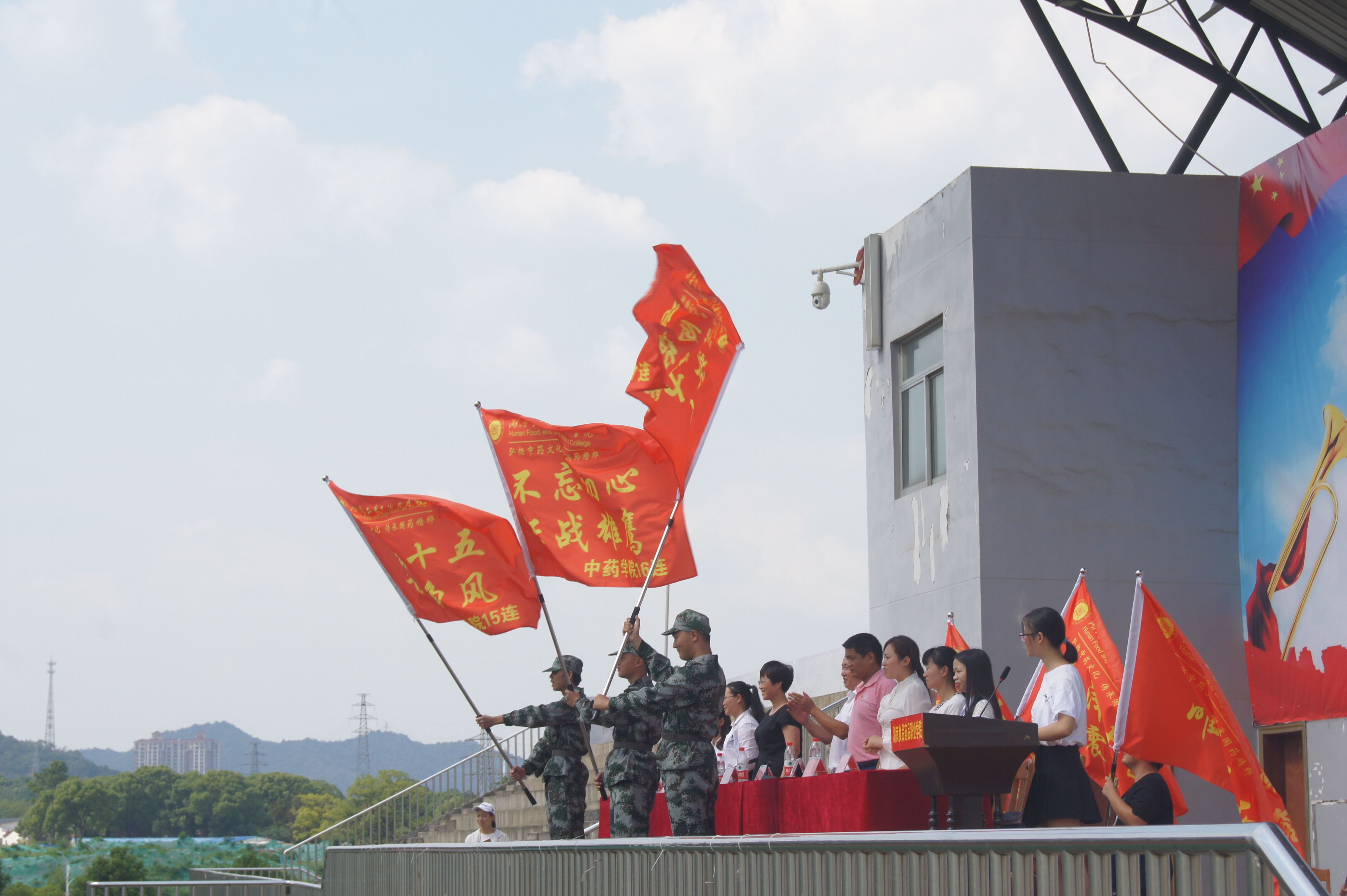 中药学院院长万能在授旗仪式上讲话,希望全体参训学生、辅导员老师要克服困难,提高认识,认真完成军训任务,他提出了思想过硬、纪律过硬、文明过硬、内务过硬的“四过硬”要求,并希望大家能养成热爱学校、关爱同学、尊敬师长、团结合作、吃苦耐劳的五种情怀。随后,十个连队的学生代表意气风发的走上主席台接受旗帜。整个训练场响起了嘹亮的口号, 当我们庄严的举起右手,在王涵同学的带领下宣读誓词,我们满怀激动,“诚实守信,遵纪守法;尊敬师长,孝顺父母;言语文明,团结同学;共同创建文明、和谐校园环境,争当优秀中药传承者与开拓者。”整齐划一的号角、迎风招展的队旗、慷慨激昂的宣誓,将整个仪式推向了高潮。