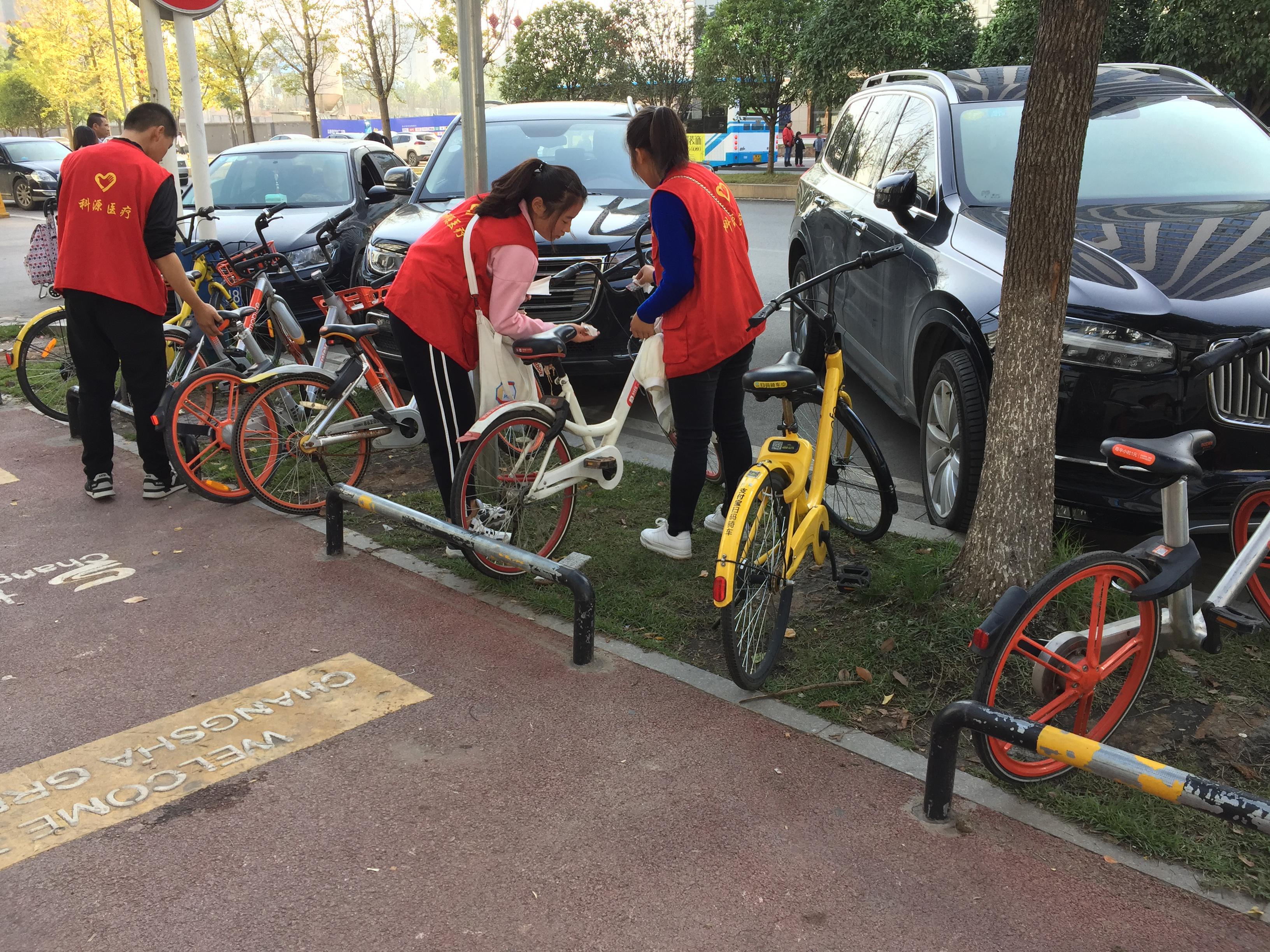 志愿者们清洁整理共享单车卫生
