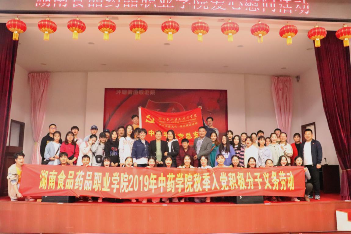 为深入开展“不忘初心,牢记使命”主题教育实践活动,2019年10月22日下午,中药学院党总支组织全体秋季入党积极分子赴坪塘镇廖月娥敬老院开展主题教育实践活动,旨在提高入党积极分子对党的认识、培养广大学子了解社会服务社会的意识,用专业知识与技能为敬老院老人们送去关爱。中药学院党总支书记杨萍、中药学院院长兼副书记万能等老师及全体入党积极分子参加。