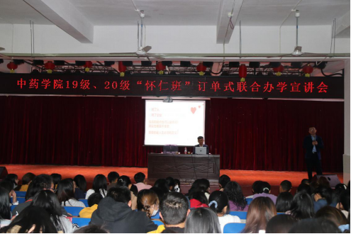 下午16:00在学校学术报告厅进行了中药学院19级、20级“怀仁班”订单式联合办学宣讲会,徐坤总经理详细介绍了“怀仁班”的招生要求、学生发展规划、福利待遇等,希望通过“怀仁班”为有需要的同学搭建一个良好的学习和实习平台,为学生职业发展助力。