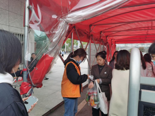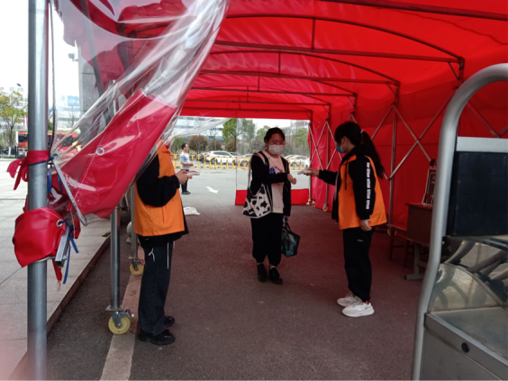 3月14日下午两点志愿者在校门口集合,接着就开始迅速进入工作状态,高峰期志愿者们分工合作,配合默契,保证对进出的每名学生都进行体温测量。
