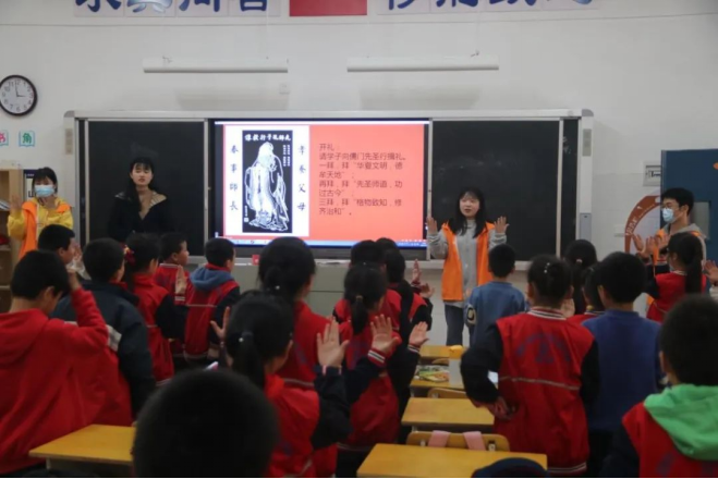 此次志愿活动,主要是给学生们讲解拜师礼。拜师礼,最早可追溯至孔子徒时期,是尊师重道的体现。志愿者给小朋友们认真讲述了拜师礼三拜和六礼束脩的含义,并带领他们一起正确行拜师礼。