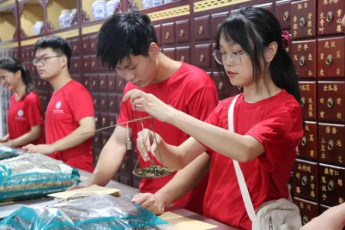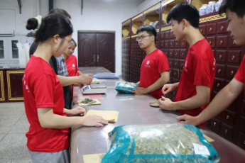 活动伊始,中药学院志愿服务队在我校中药调剂室进行凉茶的制作与包装,分别将淡竹叶、薄荷、甘草、大青叶、芦根等中药材,按其相对应的用量比例装袋、封口、包装。