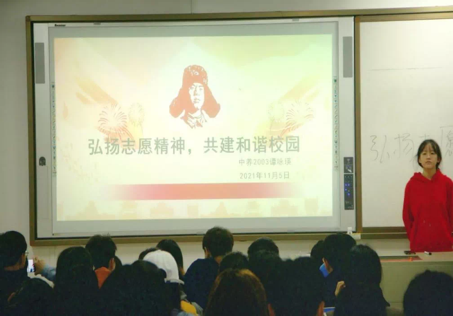 活动过程中主持人具体细致地解读了志愿者的宗旨及志愿服务精神的重大意义,并通过微视频《最美志愿者》的播放和讲解,让同学们深刻认识到志愿服务不仅是看在眼里的感动,更是落在实处的行动,更让同学们了解到志愿服务于自己而言是一种义不容辞的责任与当仁不让的义务。