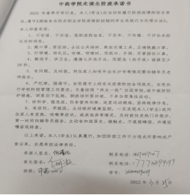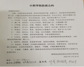各班积极响应此次防疫活动,采取分批、错时的方式领取材料,并组织同学们认真学习公约内容。同时,走读生签署走读生防疫承诺书,自觉遵守《湖南食品药品职业学院疫情防控期间学生违规行为处理办法》,切实履行防控疫情的安全责任。