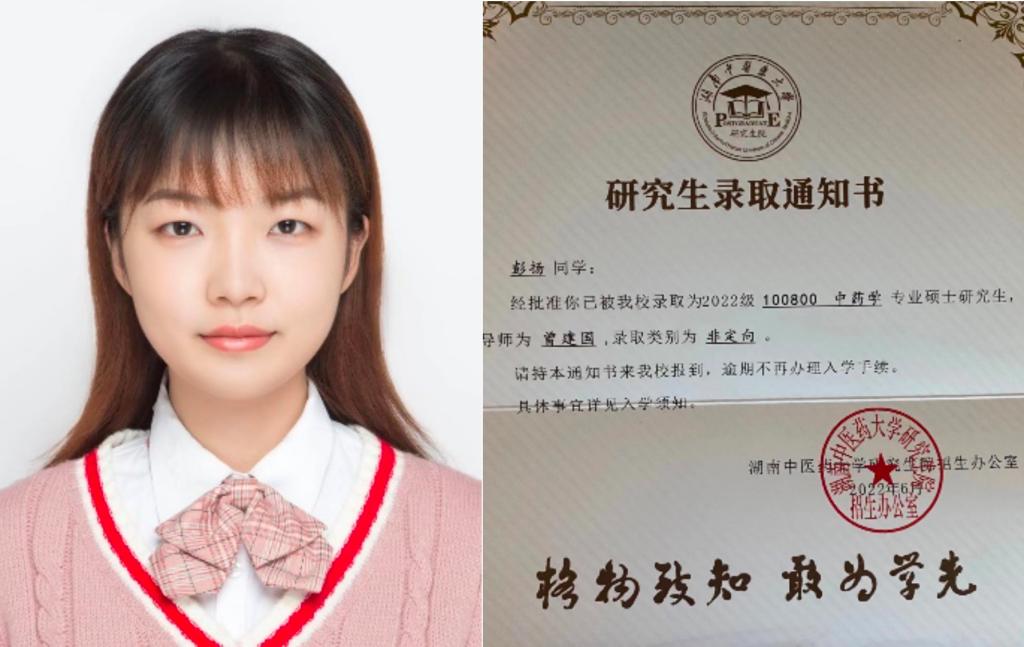 彭扬,湖南食品药品职业学院中药学院2017级中药17302班学生,2020年通过专升本考试进入湖南中医药大学湘杏学院学习,2022年通过研究生考试进入湖南中医药大学。