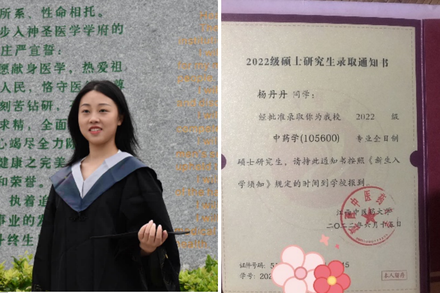 杨丹丹,湖南食品药品职业学院中药学院2017级中药17304班学生,在校期间担任中药学院第四届学生会办公室主任、班级生活委员,学习成绩一直保持在班级前列,从大一开始就确定专升本的目标。实习期间边工作边复习,于2020年7月成功考入湖南中医药大学药学院中药学专业。2021年8月备战考研,于2022年4月通过考研复试,成功上岸江西中医药大学中药学专业。