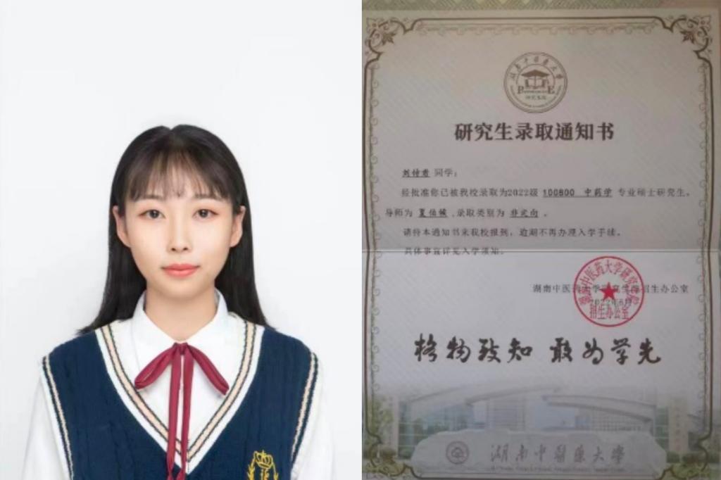 刘恃君,湖南食品药品职业学院中药学院2017级中药17301班学生,2020年通过专升本考试进入湖南中医药大学湘杏学院学习,2022年通过研究生考试进入湖南中医药大学。
