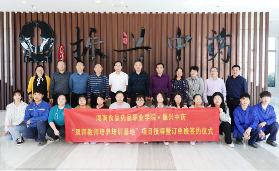 为贯彻落实学校《关于建立“教师企业实践流动工作站、双师教师培养培训基地、教师企业实践基地”工作方案的通知》精神,落实订单式联合培养,2022年11月11日上午,我校中药学院“双师教师培养培训基地”授牌暨“振兴班”签约仪式在湖南振兴中药有限公司举行,学校党委副书记、校长虢剑波,学校党委委员、副校长邓兴国,学校党委委员、组织人事处处长熊佳辉以及中药学院院长叶云华、副院长代洪波参加授牌签约仪式。湖南振兴中药有限公司董事长彭贵华率团队表示欢迎,我校实习生代表参与座谈。