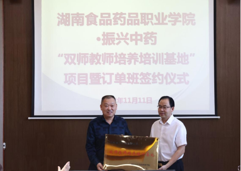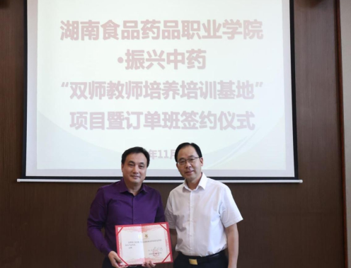 在与会人员的共同见证下,虢校长为公司技术总裁张忠勤颁发“现代产业导师”聘书,授予振兴中药“双师教师培养培训基地”,邓兴国副校长与张忠勤总裁代表双方签署订单式联合培养协议。