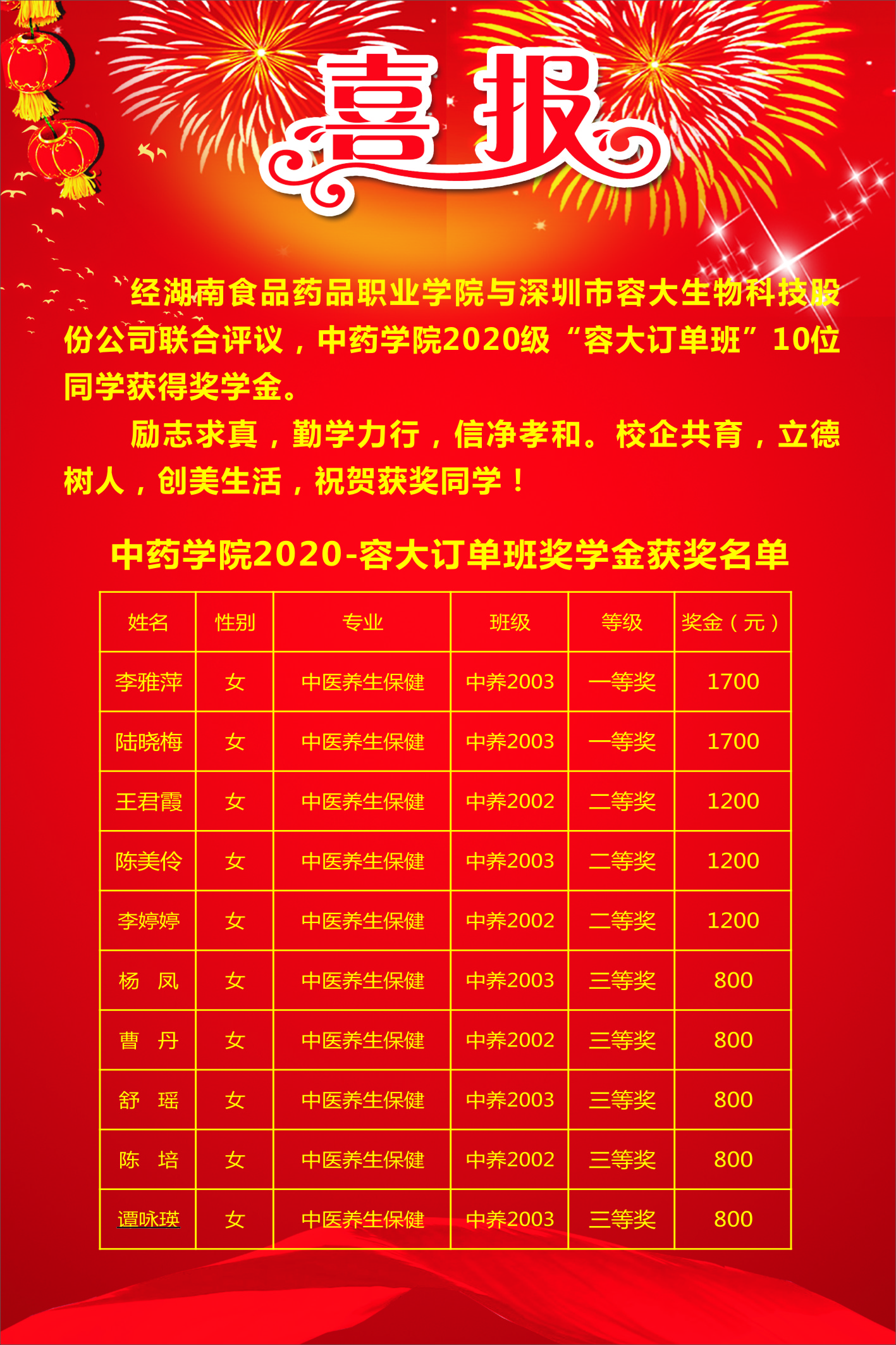 喜报——中药学院学生获深圳市容大生物科技股份有限公司奖学金