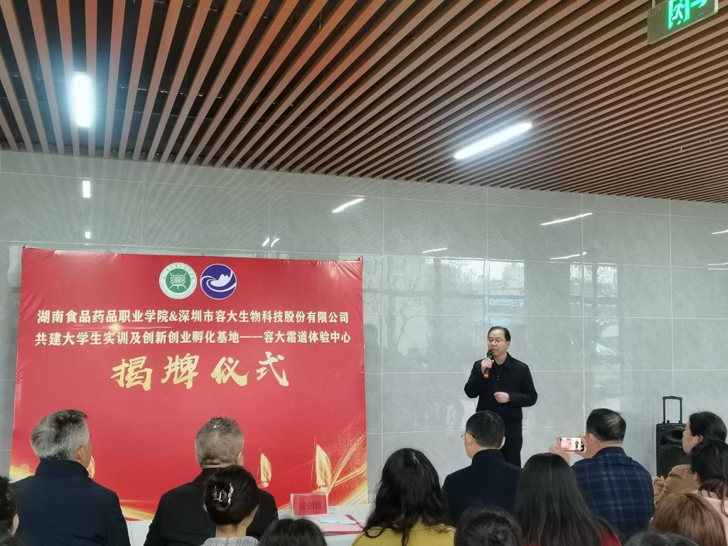 2024年3月18日,我院与深圳市容大生物科技股份有限公司在3号实验楼举行校企共建大学生实训及创新创业孵化基地暨“容大霜道体验中心”揭牌仪式。深圳市容大生物科技股份有限公司董事长韩敏、深圳市青春纳斯健康科技有限公司总经理陈琼星、容大生物湖南市场总经理谢玮及企业相关负责人,学校党委副书记、校长虢剑波,副校长邓兴国,学校相关负责人及师生代表出席仪式。
