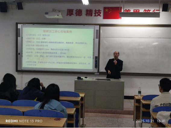 周志扬先生还针对实际生产中遇到的问题进行了剖析,如“100kg何首乌丁用25kg黑豆汁炖制后内部仍白心”“黑豆汁制备的加水量与容器选择”“炖制时间对有效成分收率的影响”等,通过对这些行业痛点的解读,让师生们清晰认识到中药炮制工艺中细节把控的重要性,深刻理解了传统炮制技艺与现代生产标准的融合之道。