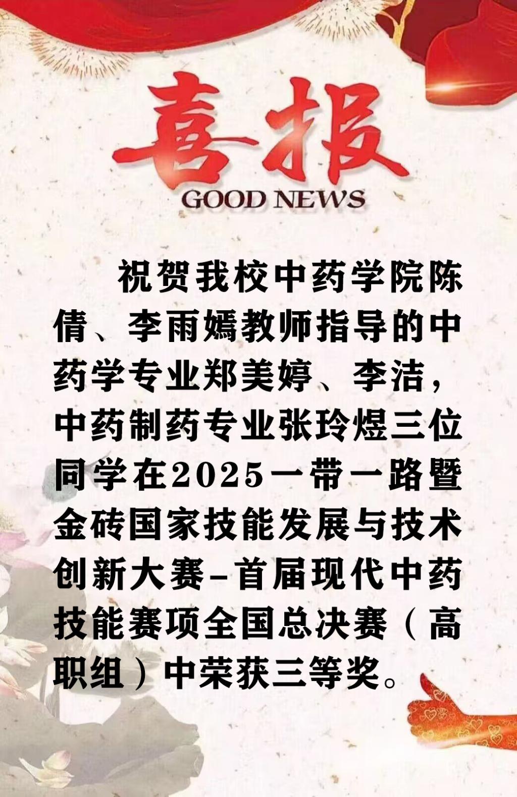 我院陈倩、李雨嫣教师指导的中药学专业郑美婷、李洁,中药制药专业张玲煜三位同学在2025一带一路暨金砖国家技能发展与技术创新大赛-首届现代中药技能赛项全国总决赛(高职组)中荣获三等奖。