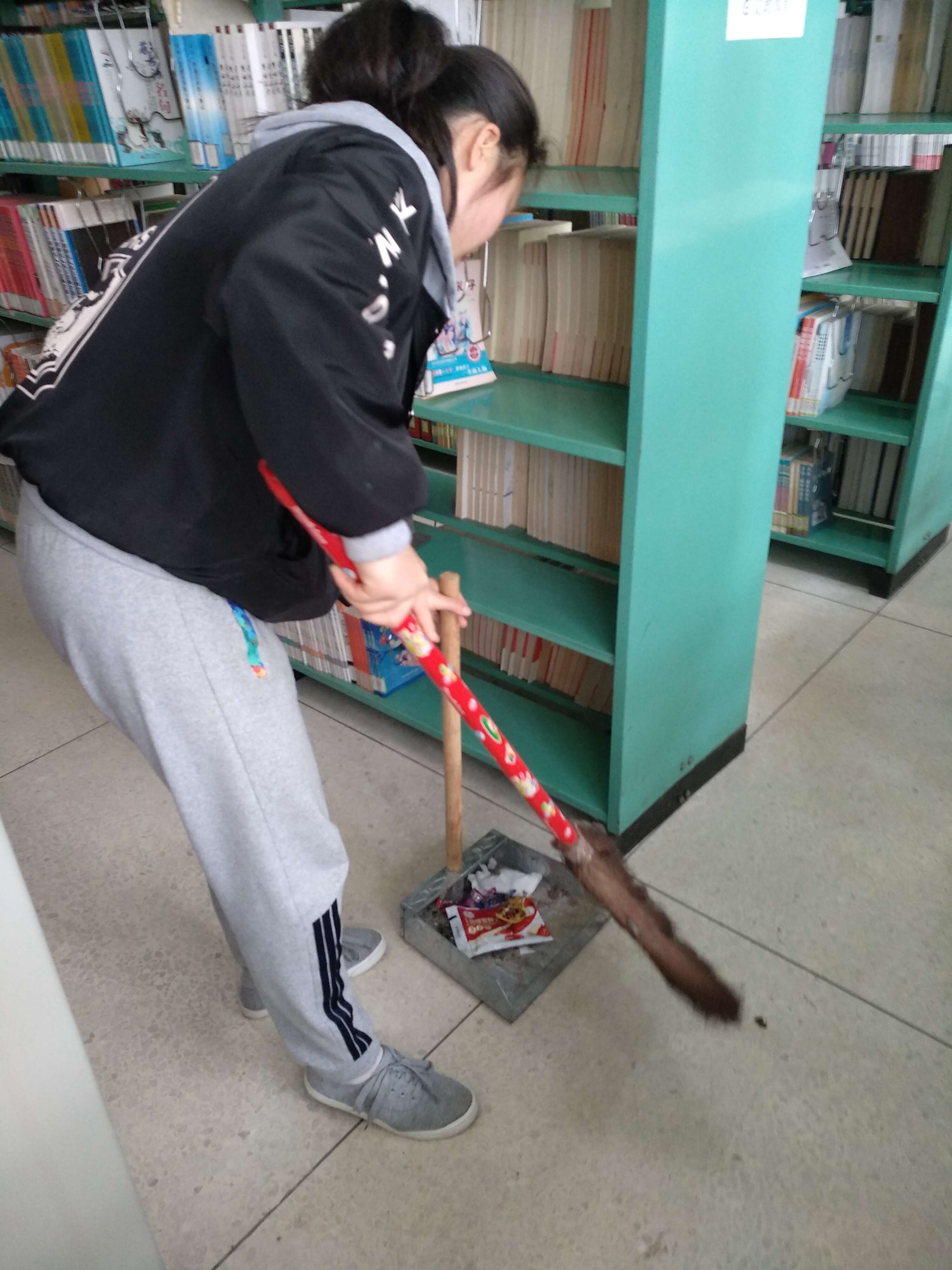 本次活动的主要任务是清扫图书馆卫生死角、整理图书等,我们将志愿者分为两组,在图书馆理员的指导下,分片包干、分工合作,不怕脏、不怕累,干得热火朝天,经过一番努力,终于将图书馆清扫的干干净净,整理的井井有条。