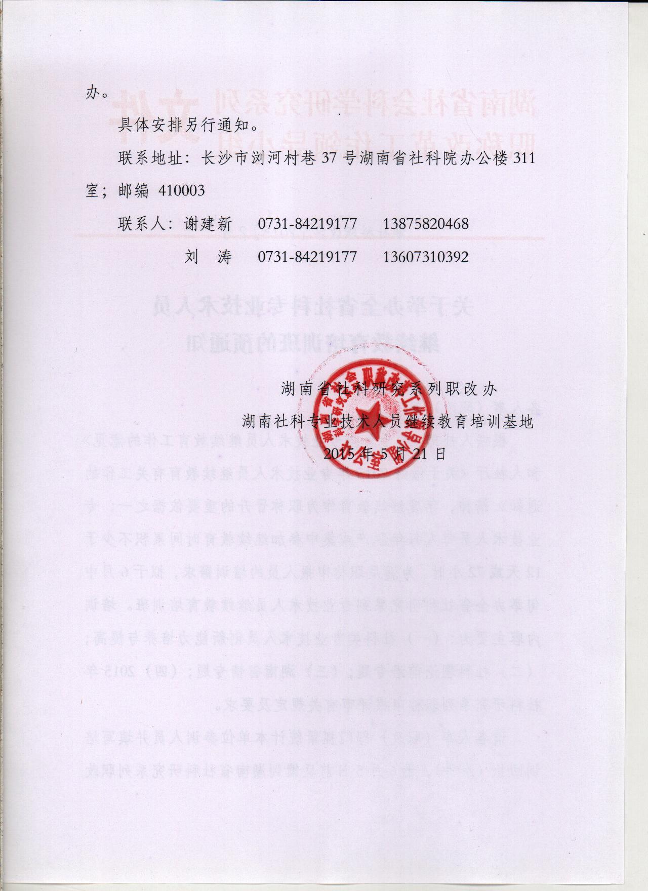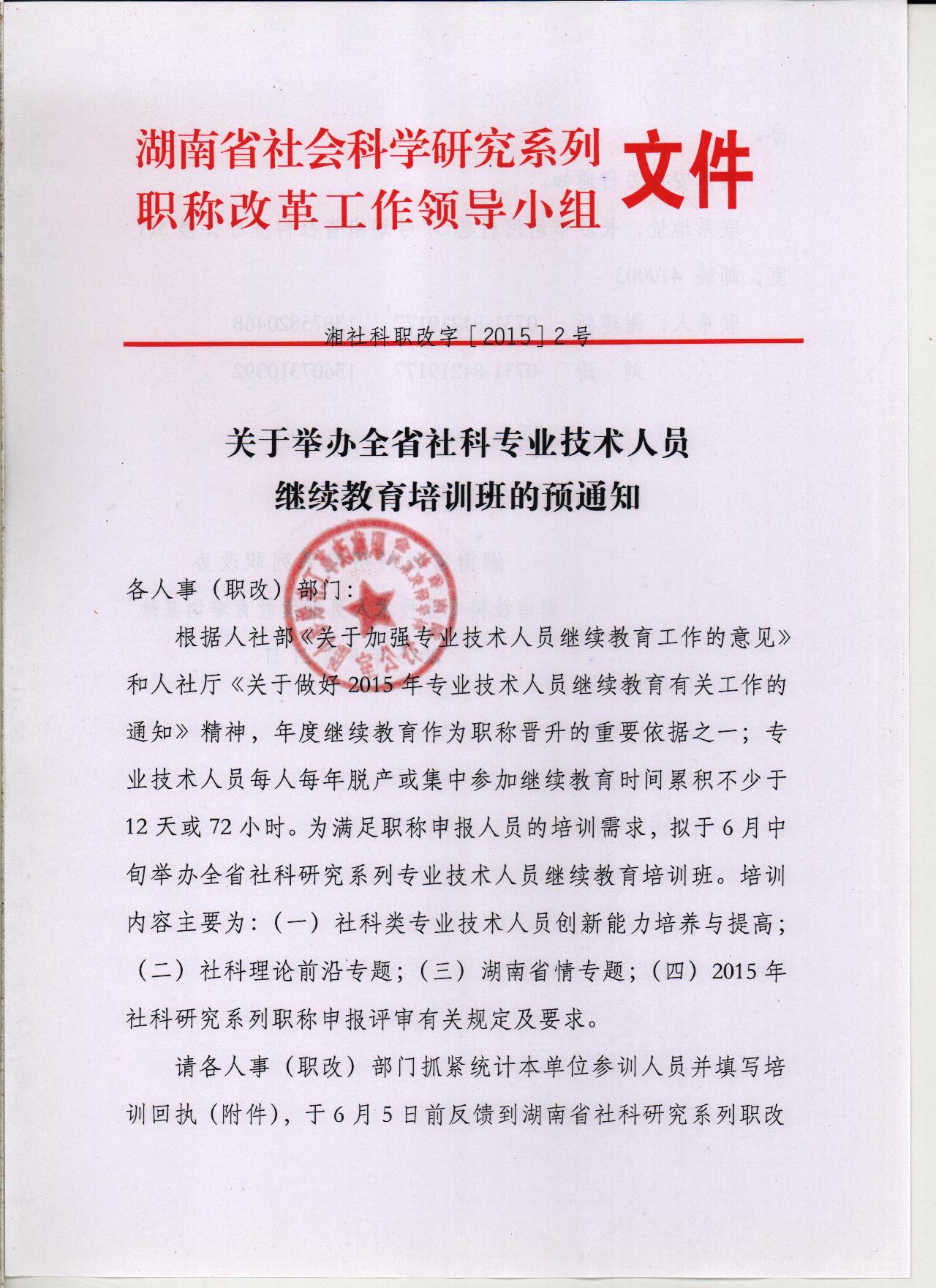 现将湖南省社科研究系列职改办、湖南社科专业技术人员继续教育培训基地《关于举办全省社科专业技术人员继续教育培训班的预通知》(湘社科职改字[2015]2号文件转发给你们,请各部门统计本部门参训人员并填写培训回执(见附件),于6月2日前反馈到组织人事处203室。